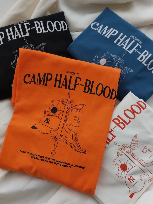 Com um design totalmente diferente da clássica camiseta do Acampamento Meio-Sangue, esta peça traz elementos sutis e importantes da história. Detalhes que talvez você nem perceba à primeira vista, como a tampa da caneta na ponta da espada, o raio de Zeus no tênis e uma frase que faz até os semideuses chorarem... afinal, os deuses estão muito ocupados para se preocuparem com seus filhos